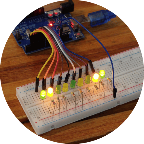 Every component is labelled. Your child identifies the Arduino, breadboard, LEDs, and wires.